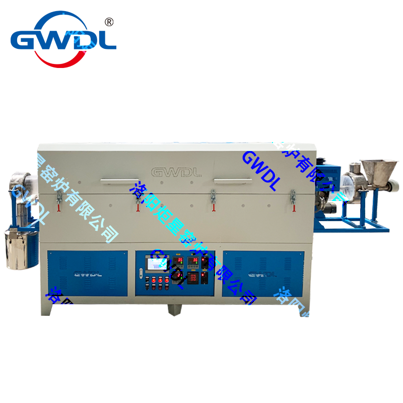 The furnaces are suitable for continuous material processing. It contains a screw feeder and a material collection barrel. Residence time in the heated zone depends on the degree of inclination and the rotating speed (which can be controlled by the customer) and the length of the working tube, in addition to the flow properties of the material. The design of the split furnace, drive system, and feeder/ collection assemblies allows the work tube to be easily removed and replaced.