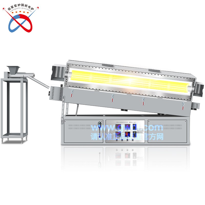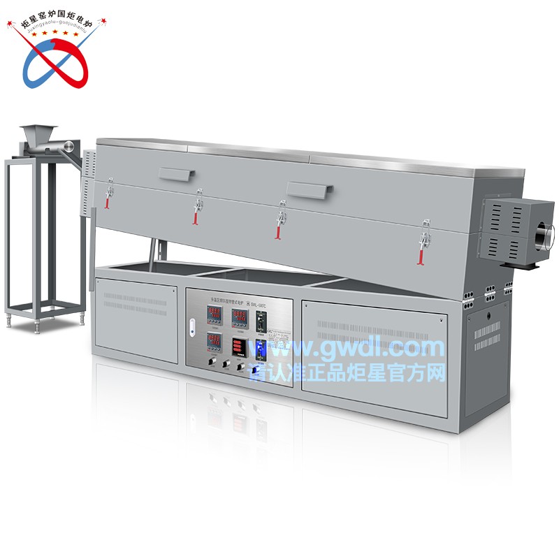 The furnaces are suitable for continuous material processing. Residence time in the heated zone depends on the degree of inclination and the rotating speed (which can be controlled by the customer) and the length of the working tube, in addition to the flow properties of the material.